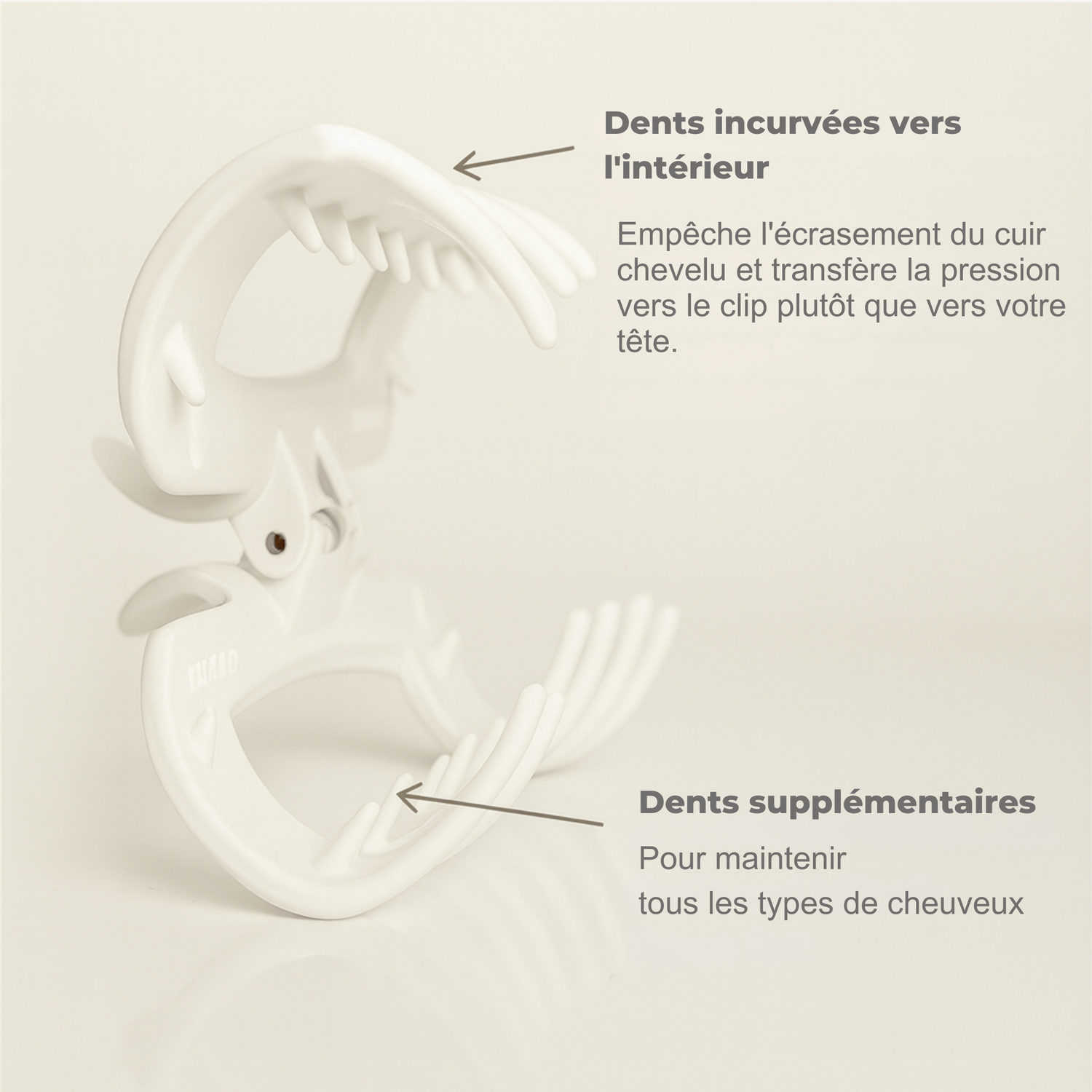 Grâce à ses dents incurvées vers l’intérieur, Ego™ répartit la pression sur le clip plutôt que sur votre cuir chevelu, éliminant tout inconfort. Ses pattes supplémentaires saisissent et maintiennent efficacement tous les types de cheveux, garantissant un maintien fiable et un confort optimal du matin au soir.